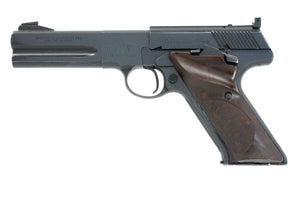 This Colt 2nd Type 4.5" Woodsman Match Target has a blue finish with brown injection molded grips with a thumbrest. It has a fixed front sight and adjustable Accro rear sight. This pistol is considered a flattop model which were produced from 1953 to end of production of the 2nd series pistols.
