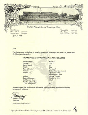 This Colt Woodsman Match Target was sold to the United States Government and was shipped to the Officer in Charge at the Naval Supply Depot of Norfolk, Virginia on October 26th, 1943. It was on Colt Factor Order #3237 in a 375 gun shipment.