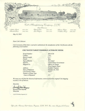 This Colt Woodsman Match Target was sold to the United States Government and was shipped to the Officer in Charge at the Naval Supply Depot of Norfolk, Virginia on October 26th, 1943. It was on Colt Factor Order #3237 in a 375 gun shipment.
