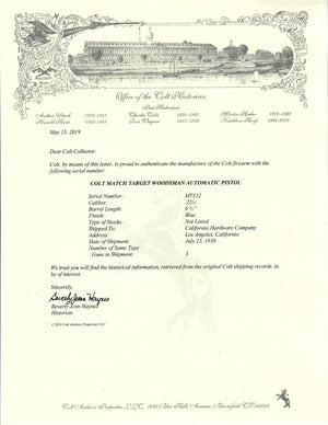 This Colt Woodsman Match Target shipped to the California Hardware Company in Los Angeles, California on July 23rd, 1938 in a 3 gun shipment.