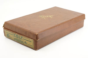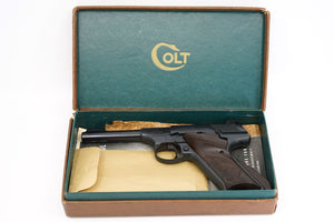 This 2nd Generation Colt Woodsman Sport has a round top slide with the Coltmaster rear sight. Wearing original brown injection molded plastic grips with integrated thumb rest. Currently attached is the larger grip adapter.