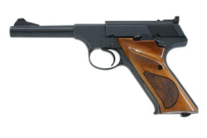 This Third Series Colt Woodsman Sport has a blue finish and wears the original walnut grips. It has a fixed front sight and an Accro adjustable rear sight.
