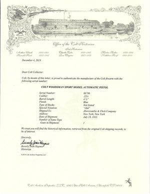 This Woodsman Sport was shipped to the Abercrombie & Fitch Company in New York, New York on July 18th, 1933 in a single gun shipment. The factory letter states it was shipped with a 4-1/2" barrel, blue finish and a special notation of "Old".