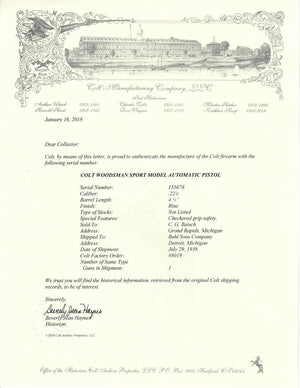 This particular Woodsman was a special order and was sold to C.G. Baisch of Grand Rapids, Michigan and shipped to Buhl Sons Company of Detroit, Michigan. It was in a single gun shipment on July 29th 1938.