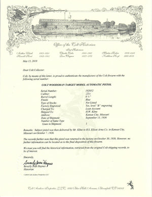 This Colt Woodsman Match Target pistol was shipped in a single gun shipment on September 15th, 1936 to H.W. Kline and charged to the Loan account. H.W. Kline then delivered the pistol to the R.S> Elliot Arms Co. in Kansas City, Missouri on October 7th, 1936. The records further note that this pistol was returned to the factory on October 30th, 1936. However, no further information can be located as the final disposition of this firearm.