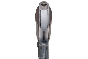 The slide is marked with an E above the firing pin stop plate. The Mainspring housing also has an E stamped on the bottom of it visible forward the lanyard ring. Barrel is marked with a single P that is visible through the ejection port. Grips are the original 13 rows of checkering between the diamond screws. Magazine is Remington UMC produced as can be seen by the short baseplate.
