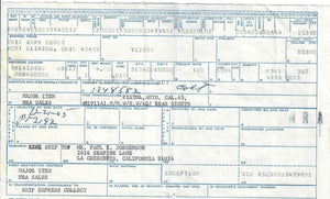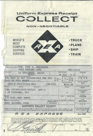 This pistol is accompanied by the packing slip as well as a Railway Express Agency receipt that shows a declared value of $103.00 for this pistol.