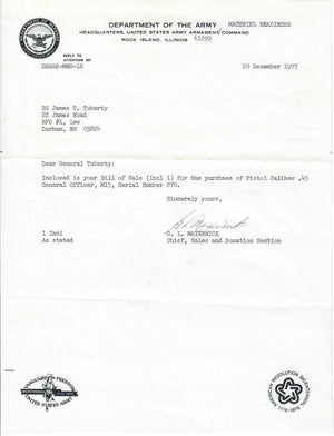 Accompanying this pistol is 2 of the 3 original magazines that would have been issued with this pistol. The magazines were etched with the serial number with an electric pencil. When general left active service they were give the option of returning or purchasing their pistol as seen by the attached documentation.
